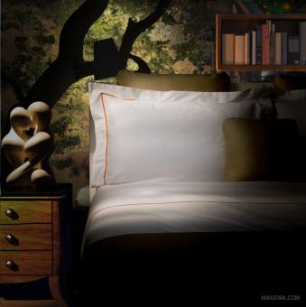 Customize your Essentia shams with a discreet bourdon embroidery in orange. Its clean, sober and quiet lines remain unchanged. The fabric is made of extra-long cotton fibers. A higher fibre category than that does not exist. 3 flanges, 2 shams