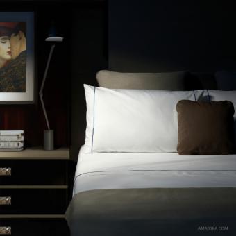 Completo Letto Essentia Custom Bourdon Percalle 400 TC Bianco con Ricamo in Blu Grigiastro