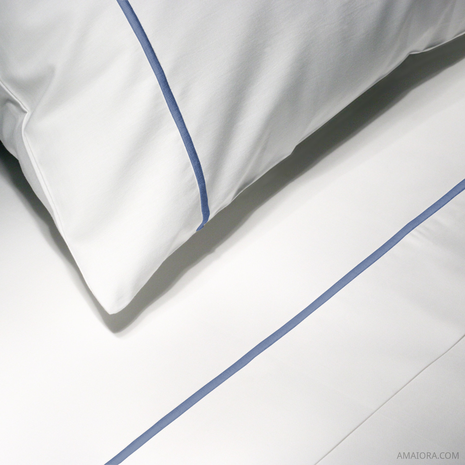 Personalizza il tuo completo letto Essentia con un discreto ricamo bourdon nel prezioso cotone egiziano makò in blu grigiastro. Le sue linee nitide, sobrie e tranquille rimangono invariate. Composto da: sotto, sopra, 2 federe.