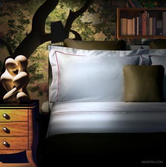 Completo Letto Essentia Custom Bourdon Raso 600 TC Bianco con Ricamo in Rosso Lampone
